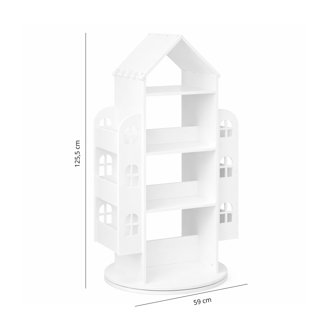 Sa hauteur de 125 cm en fait une bibliothèque chambre enfant imposante et généreuse, capable d'accompagner votre enfant sur de nombreuses années. Sa large base de 59 cm garantit une stabilité optimale malgré la rotation, et ses coins arrondis assurent une sécurité totale pour les tout-petits au quotidien.