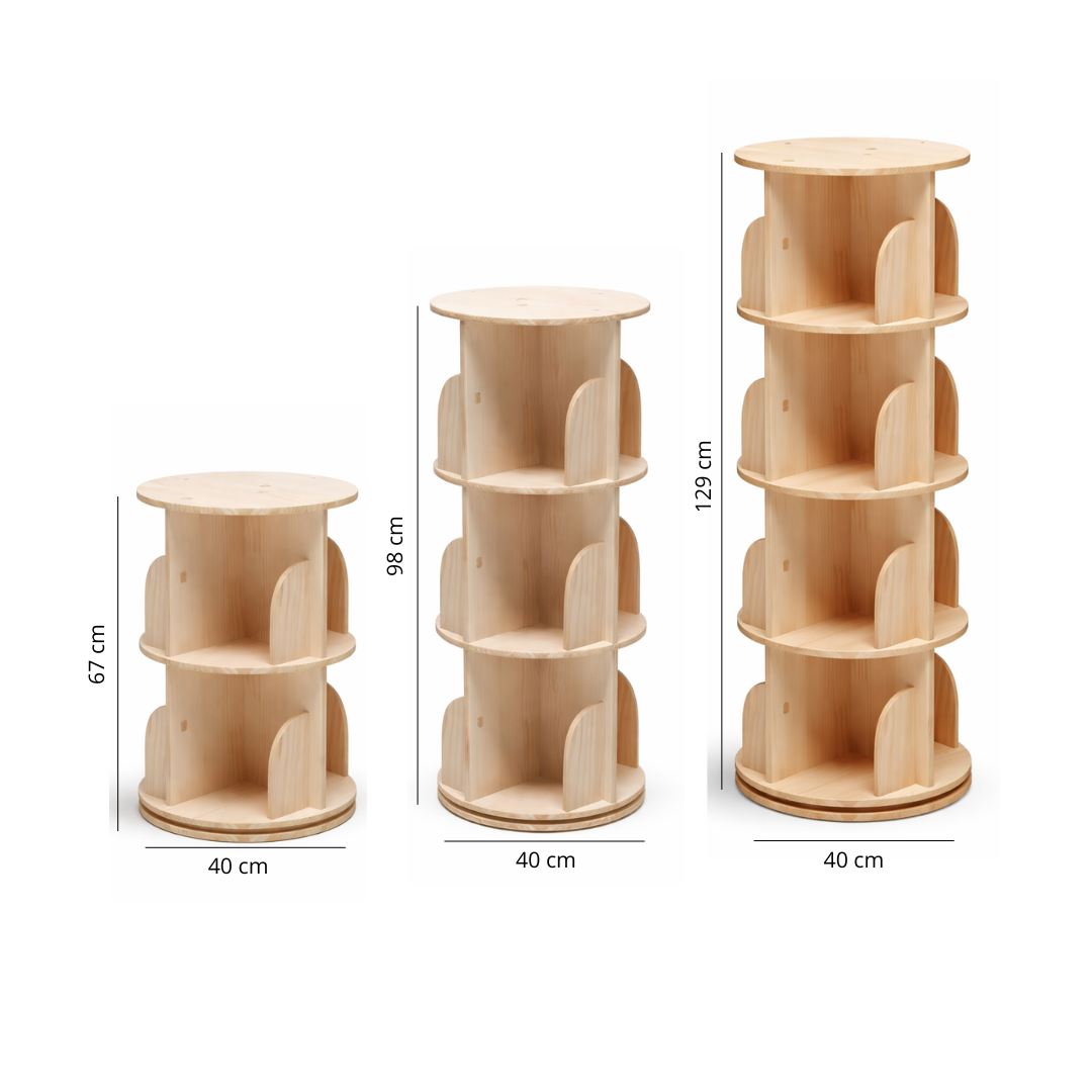 Ses 3 niveaux rotatifs offrent un espace généreux pour organiser livres, albums illustrés et petits jouets par catégorie. Votre enfant peut faire tourner la bibliothèque seul, explorer chaque face, repérer et attraper son livre préféré en totale autonomie, sans l'aide d'un adulte. Un geste simple et naturel qui développe l'initiative, la confiance en soi et l'amour de la lecture au quotidien.