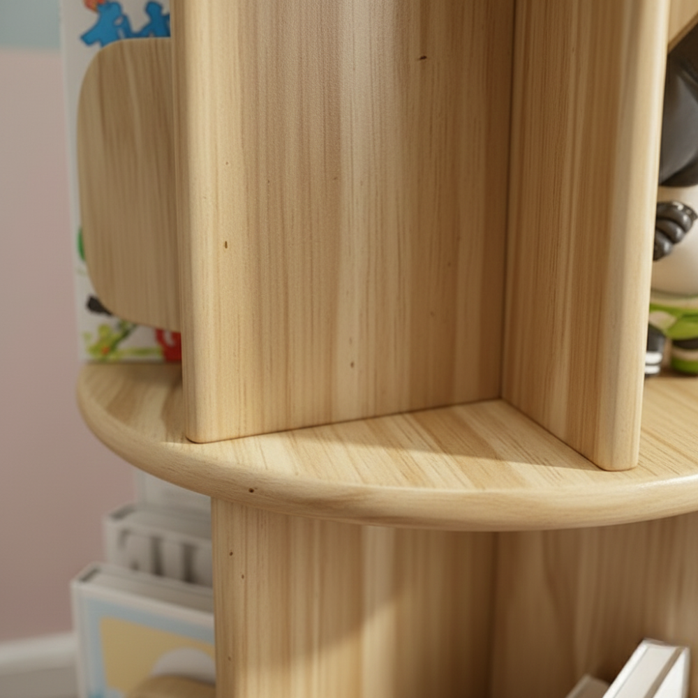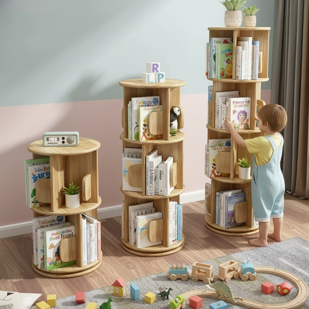 Cette bibliothèque rotative offre un espace de rangement compact et accessible pour les livres et petits objets. Sa structure verticale facilite l’organisation tout en occupant peu d’espace au sol. Les niveaux ouverts permettent à l’enfant de visualiser facilement ses livres et de les attraper de manière autonome.