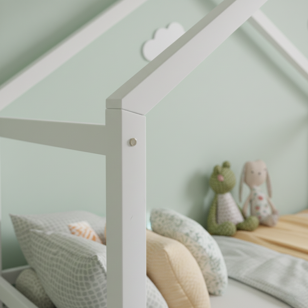 Ce lit cabane propose un espace de repos accessible, pensé pour accompagner l’autonomie de l’enfant. La structure basse permet d’entrer et sortir facilement du couchage, tandis que la forme de maison crée un environnement délimité et rassurant dans une chambre d’enfant.